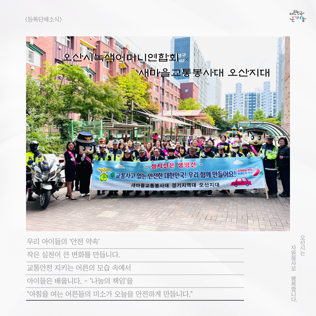 【자원봉사현장】 오산시녹색어머니연합회 × 새마을교통봉사대 오산지대 첨부파일 5개 (다운로드 0회) 작성자 : 운영자 / 등록일 : 2025.11.10 (14:13) / 조회 : 72 목록