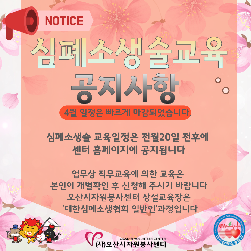 검색 취소 4월 일정공지 2026.03.27 3월 심폐소생술 교육 2026.03.27 11월 심폐소생술교육 2025.12.04 10월 심폐소생술 교육 2025.11.10 11월 심폐소생술교육.. 2025.10.23 9월 심폐소생술 교육 2025.10.17 8월 심폐소생술교육 2025.10.15 8월 교육일정 2025.07.21 7월 심폐소생술교육 .. 2025.06.19 4월 심폐소생술교육 .. 2025.03.25 3월 심폐소생술교육 .. 2025.02.28 심폐소생술 단체(늘푸.. 2025.02.18 전체선택 선택반전 <<<12345>>>
