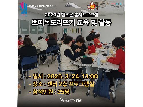 검색 취소 세마중학교,문시중학.. 2026.03.27 [핸즈온봉사프로그램].. 2026.03.27 불용의약품 배출 캠페.. 2026.03.27 세교마을봉사센터 환.. 2026.03.27 오!해피가족봉사단 3.. 2026.03.27 노래공연봉사단 라온.. 2026.03.26 2026 중학교 자원봉사.. 2026.03.23 아띠봉사단 오산천 정.. 2026.03.23 신년맞이 재생화장지 .. 2026.01.15 2025 멸균팩 구출작전.. 2026.01.06 청소년 자원봉사 FLEX.. 2025.12.22 전체선택 선택반전 <<<12345>>>