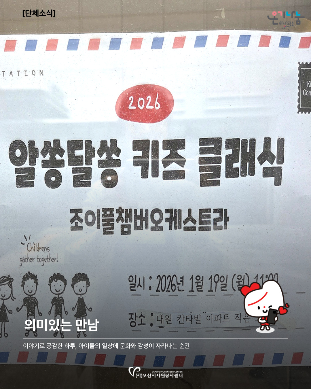 | Contact Us Since 1998. 자원봉사활동자원봉사 참여 안내전문봉사단자원봉사단체활동처인센티브교육 및 프로그램자원봉사 교육안내자원봉사 프로그램 안내토요 프로그램교육 신청신청 교육 조회 및 취소심폐소생술 교육센터심폐소생술 교육센터 소개대한심폐소생협회 교육인증기관심폐소생술 교육정보심폐소생술 교육사진자료커뮤니티현장가GO봉사하GO보도자료Q&A정보센터공지사항서식자료실대관 및 대여소식지자원봉사 동영상자료센터소개이사장 인사말센터소개조직도 및 직원소개센터 마스코트 BONZBONZS명예의 전당세교마을 봉사센터찾아오시는 길 : 현장가GO 등록단체와 활동처의 훈훈한 감동이 있는 자원봉사 현장을 사진으로 전해드립니다. [조이풀 챔버 오케스트라] 알쏭달쏭 키즈 클래식, 신나는 음악 여행 첨부파일 5개 (다운로드 0회) 작성자 : 운영자 / 등록일 : 2026.01.29 (09:46) / 조회 : 44 목록