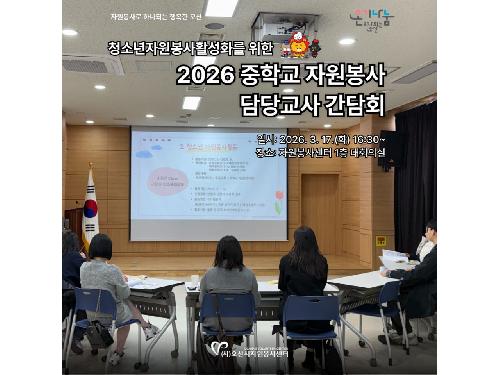 검색 취소 세마중학교,문시중학.. 2026.03.27 [핸즈온봉사프로그램].. 2026.03.27 불용의약품 배출 캠페.. 2026.03.27 세교마을봉사센터 환.. 2026.03.27 오!해피가족봉사단 3.. 2026.03.27 노래공연봉사단 라온.. 2026.03.26 2026 중학교 자원봉사.. 2026.03.23 아띠봉사단 오산천 정.. 2026.03.23 신년맞이 재생화장지 .. 2026.01.15 2025 멸균팩 구출작전.. 2026.01.06 청소년 자원봉사 FLEX.. 2025.12.22 전체선택 선택반전 <<<12345>>>